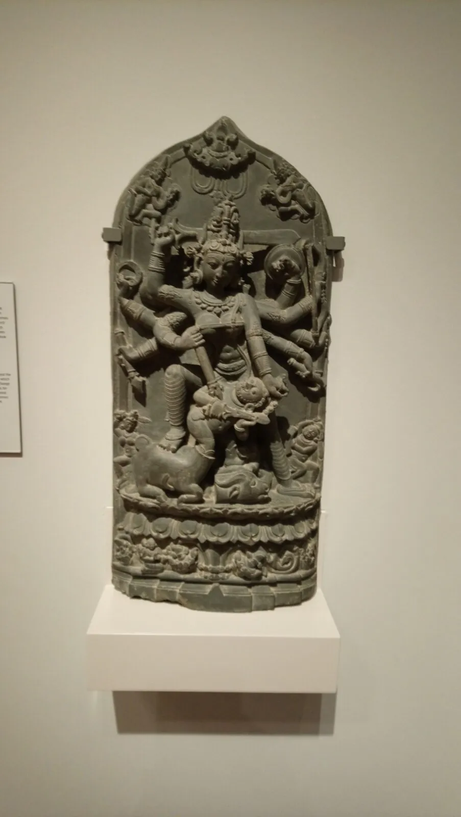 In the Rijksmuseum Amsterdam, an ancient Hindu statue, Durga killing the buffalo demon, is on display.